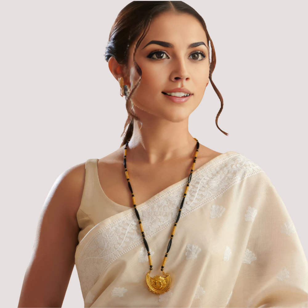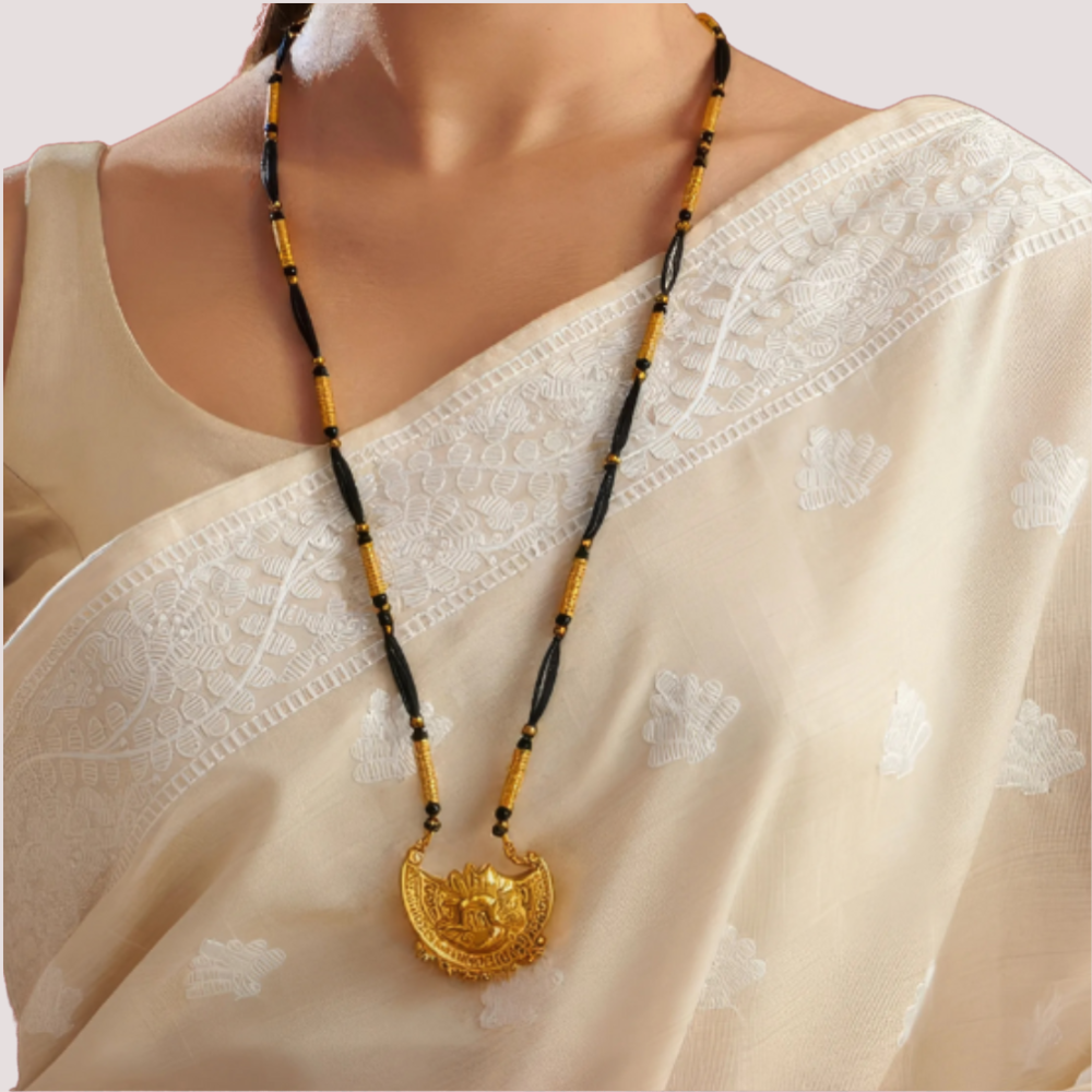 Celebrate sacred elegance with the Eternal Lakshmi Heritage Mangalsutra — a regal expression of marital devotion and divine grace. Featuring a beautifully sculpted Lakshmi pendant in antique gold, suspended on twin strands of classic black and gold beads, this long mangalsutra embodies timeless tradition with a luxurious touch.