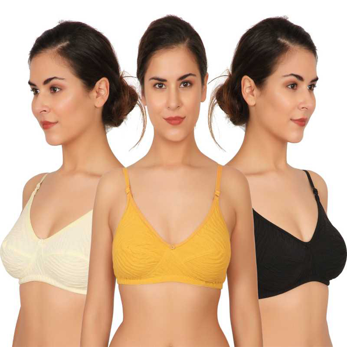 Get comfortable wire-free support with Everyday Smooth Wirefree Cotton Bra Lot 3. Soft cotton rich fabric keeps you comfortable and fresh in all seasons.These classic coverage bras have no wire, which fit beautifully under t-shirts as well as Indian ethnic wear. The straps with soft undersides are well-aligned towards the center of cup to provide better balance to the bust. Adjustable straps allow to adjust the fitting of bra and back hook-eye closure keeps bra in right place. These bras are further complimented by reinforced seams at under bust as well as broad side wings for better support and comfort. This smooth look wirefree bra provides support with smoothing results.