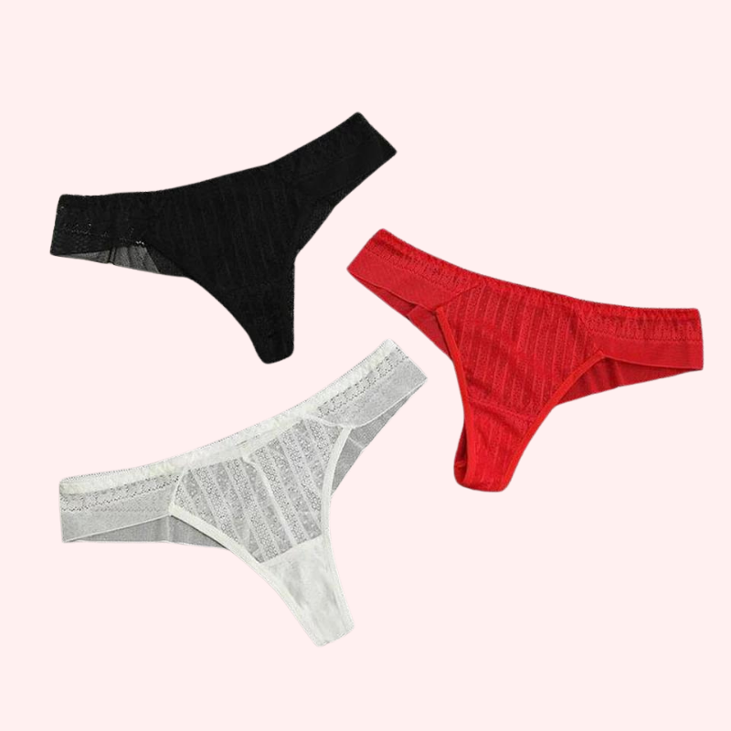 Our Flirty Lace Women’s Thong Underwear, coming in a set of four. These undies have cute lace patterns for a fun and playful vibe. They fit comfortably, hugging your curves just right while letting you move freely. Made from soft, breathable fabric, they keep you comfy all day long. Perfect for spicing up your underwear drawer, whether it’s for everyday wear or dressing up for something special. And you’ve got plenty of colors and patterns to choose from, so you can show off your unique style.