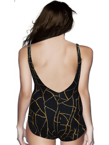 Gold Embellishment Black Swimsuit with decorative gold coloured embellishmenton a seductive neckline,make a statement and get people talking for all the right reasons with this sexy little number! Swimsuit in a premium design, made from a soft microfiber fabric,features soft foam pads, elasticated under the bust at the front, for ultimate style and attitude.