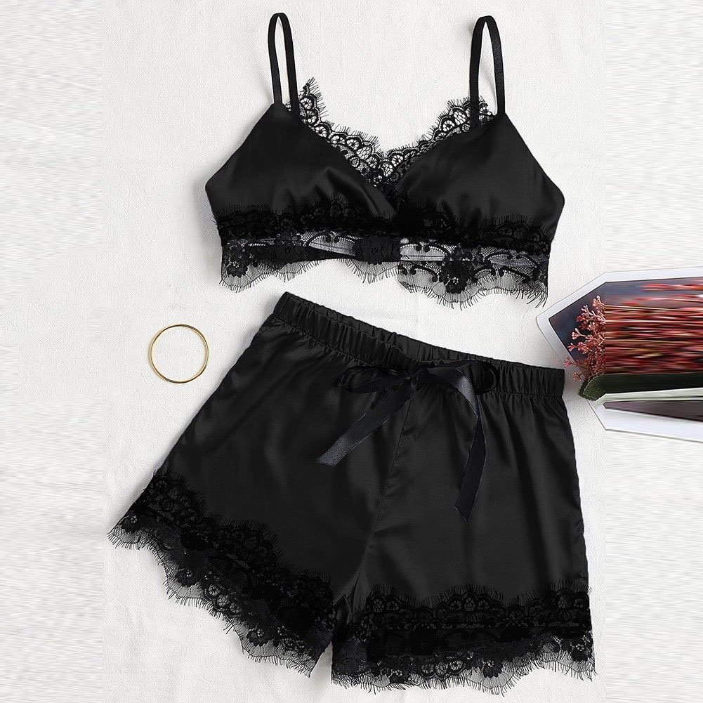 Sometimes less is more, No frills just simple luxury. Feminine and Elegant !!you will fall in love with this  luxury satin loungewear set, in a satin, lace trim bra top looks stunning, ,for extra comfort the shorts bottom has an elasticated waist and ties for a better fit, these shorts will keep you comfy and look great