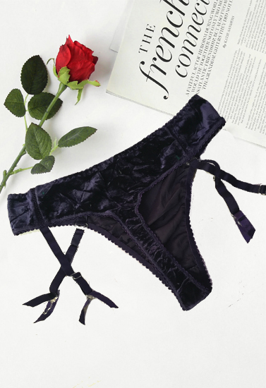 Unique fusion design of a panty and garter belt with a modern lace design. Made of polyester and elastane. Sewn-on elastic waistband with thin stripes. Stretch velvet front has a silky feel. Trimmed sides and minimal back are sexy to see and stretch to fit. Front of leg openings have sewn-on elastic for fit. Four detachable exposed elastic garters have adjustable coated plastic hardware hosiery clips at ends. This Marlon Purple Velvet Thong With Attached Detachable Garters made with a premium, soft velvet fabric, comfort covered waistband, and are tag free.