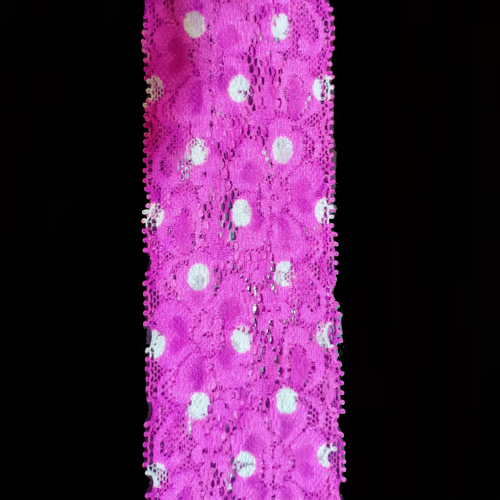 This is a very pretty stretch flounce lace in a pretty pink colour. It has a finished top edge .The lace is excellent quality with a soft handle and drape.