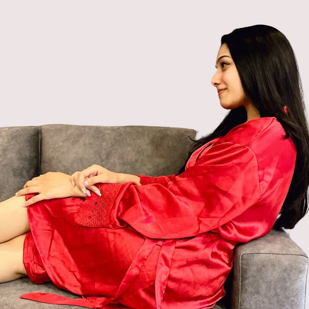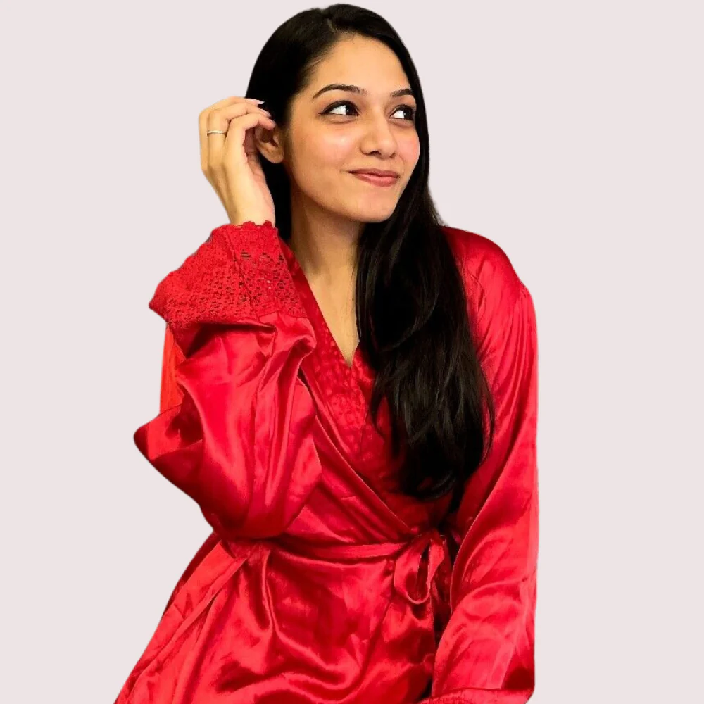 Introducing the Red Silk Satin Robe with Elegant Lace Trim. This robe is made from smooth, high-quality silk satin that feels soft and luxurious. The rich red color looks sophisticated and attractive. Beautiful lace trim decorates the sleeves and hem, adding a delicate touch. The robe wraps comfortably around you and has a matching silk belt to tie at the waist for a flattering fit. It’s perfect for relaxing at home or for special evenings. The lightweight fabric drapes nicely, keeping you cool and comfortable. Add a touch of elegance to your lingerie collection with this stunning red silk satin robe.