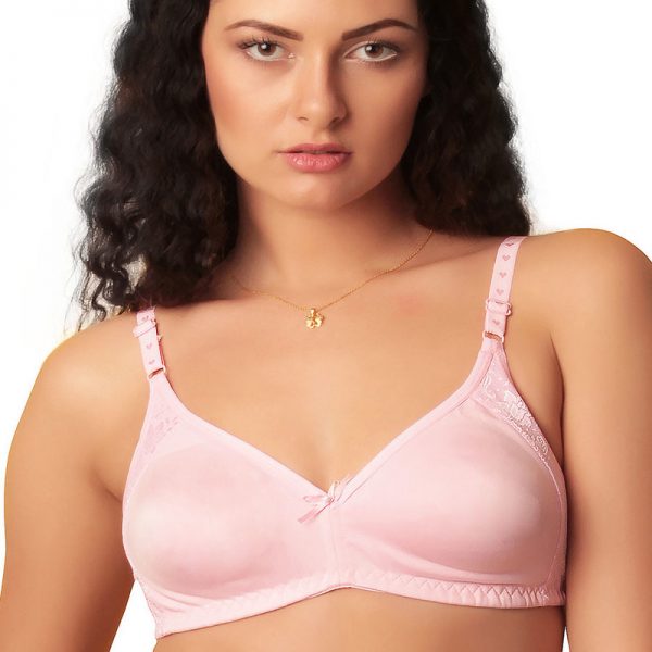 This soft cup, wireless bra is soft cotton jersey, with lining that extends to the sides and has pockets to insert prostheses or removable padding, not included. 100% cotton jersey with elastic straps and edge trim . This Beautiful cup is comfy! A oyster edge along the top front is feminine and pretty. Two-part seaming in the cups gives a nice, rounded appearance with front projection.