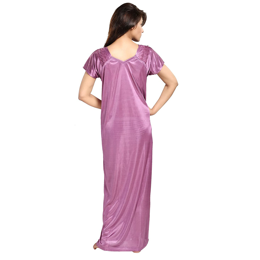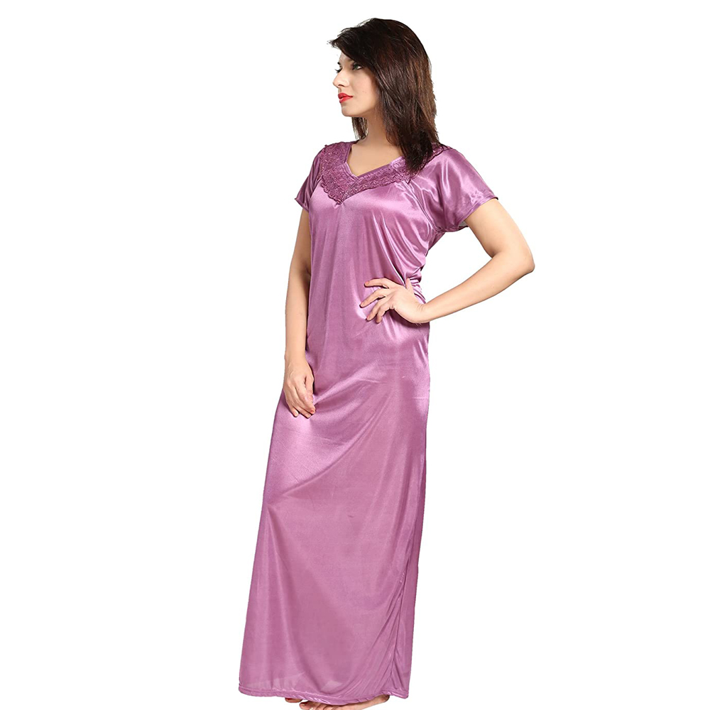 Snazzyway Purple Satin Half Sleeves Full Length Nighty set features a single night gown all matching your personality. The fabric gives a soft and luxurious feel.It has been styled in solid colour with simple and plain satin beauty, while the other has been designed with floral print. Instead of this satin gives more flexibility on your bed.